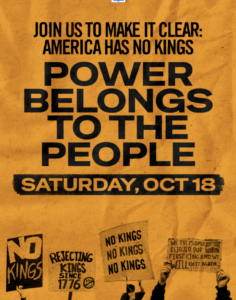 Take action: Visit the No Kings website to learn about events and activities on October 18th in your community. Show up, be loud, be heard, be seen and make a difference